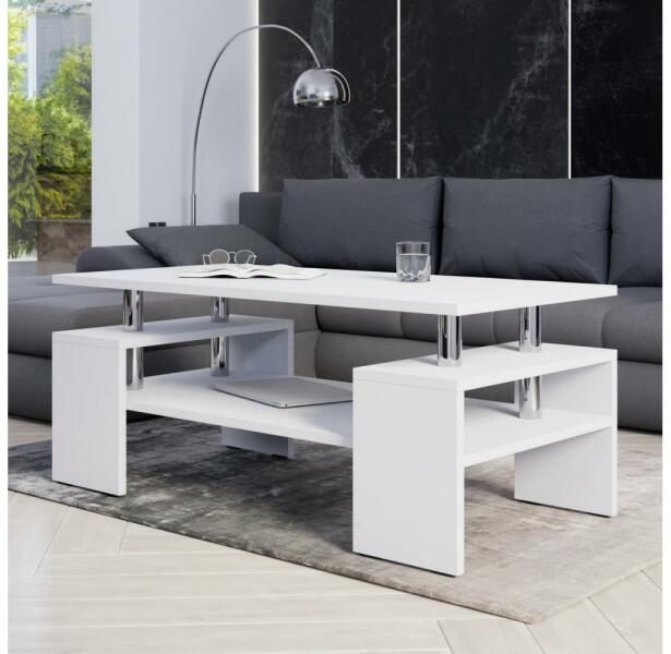 Egy dohányzóasztal, amelyen tárolhatja azokat a dolgokat, amelyeket kéznél szeretne tartani. Egyszerű, modern stílusával bármilyen otthonba illik. Laminált lemezből készült, vastagsága 22 mm (lábak és lap) és 16 mm (polcok). Műanyag csövek krómfényű fényezésben. Ez a bútordarab szétszedve érkezik.