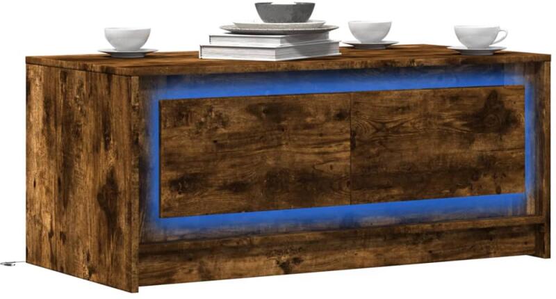 Díszítse nappaliját ezzel a modern, LED-lámpákkal ellátott dohányzóasztallal, mely könnyedén beleolvad otthona berendezésébe. Tartós anyag: A szerelt fa kivételes minőségű, sima felületű, szilárd, stabil, és ellenáll a nedvességnek. Masszív asztallap: A kisasztal masszív asztallapja biztonságos felületet biztosít, amelyre italokat, vázákat, gyümölcstálakat vagy dí