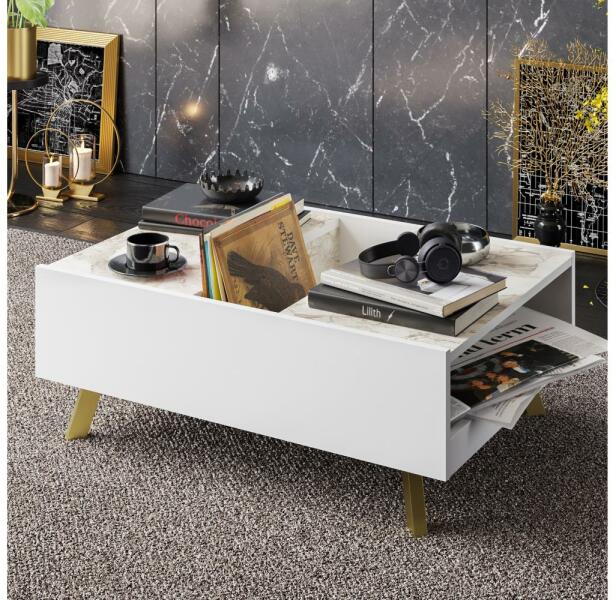 FRIDA dohányzóasztal. Egyszerű, modern stílusának köszönhetően bármilyen otthonba illik. Elegáns megjelenés a márvány dekornak köszönhetően. Azoknak a dolgoknak a tárolására szolgál, amelyeket szeretne kéznél tudni. A lap laminált forgácslapból készült. Anyagvastagság: 1,8 cm. Az asztal lábai fémből készültek. A lábak színe: arany.
