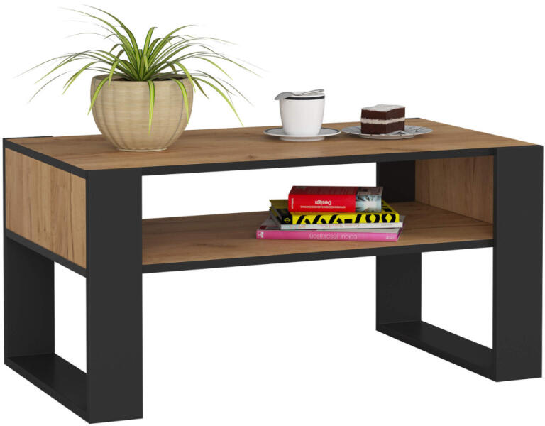 Modern és praktikus dohányzóasztal laminált lapból, tölgy craft színben fekete lábakkal. Tágas felületével és kiegészítő polcával tökéletes választás mind modern, mind hagyományos otthonokba. Stílusos és praktikus dohányzóasztal a modern otthonbaAz AKORD DOMI dohányzóasztal tökéletes egyensúlyt teremt a funkcionalitás és az esztétika között. A tölgy craft szín