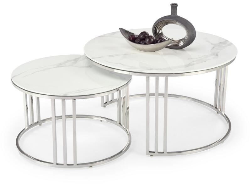 Mercury 2 dohányzóasztal A Mercury 2 dohányzóasztal szett okos megoldás olyan helyiségekbe, ahol néha több tárolóhelyre van szükség, máskor pedig elegendő hely kell a mozgáshoz körül. Ha szükséges, az egész kisebb asztalt elrejtheti a nagyobb alá. Mindkét asztal teteje üvegből készült márványmintával. A fényes rozsdamentes acél talppal együtt friss egészet alkotnak