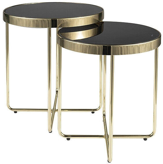 Elegáns és modern dohányzóasztal szett luxus kivitelben A Saga dohányzóasztal szett két gyönyörű, kör alakú asztalkából áll, amelyek tökéletesen ötvözik a modern dizájnt és a funkcionalitást. Az asztalok edzett üveg lapja fekete színű, míg a karcsú, fém váz elegáns arany bevonattal rendelkezik. A nagyobb asztal 50 cm magas, míg a kisebb 45 cm, ami lehetővé teszi a