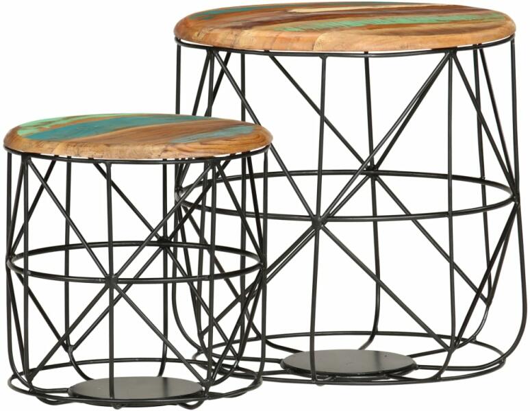 Színe: fekete Anyaga: tömör újrahasznosított fa, porszórt bevonatú vas Mérete (nagy): 45 x 45 cm (Átmérő x Ma) Mérete (kicsi): 36 x 36 cm (Átmérő x Ma) Felületkezelés: csiszolt, részben festett és viaszolt Összeszerelést igényel: igen A csomag tartalma: 2 db dohányzóasztal Ez az antik stílusú fa dohányzóasztal-készlet két különböző méretű asztalt tartalmaz, mely