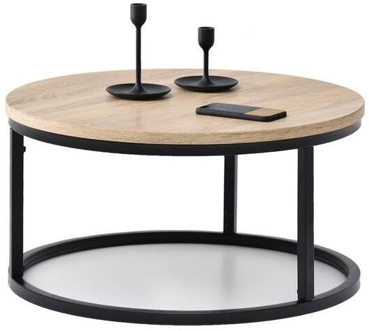 Felhasznált anyagok: asztallap - fóliázott MDF-lap lábazat - porszórt fém Színek: asztallap - sonoma lábazat - fekete Méretek: magasság - 32 cm átmérő - 60 cm asztallap vastagsága - 1,8 cm