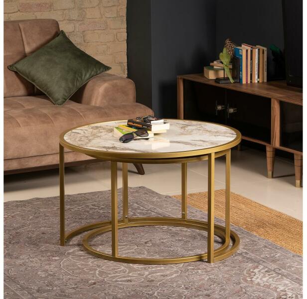 Két TAMBUR kávésasztalból álló szett. Az egyszerű, modern stílusnak köszönhetően bármilyen otthonba illik. Elegáns megjelenés a márvány dekornak köszönhetően. . Azoknak a dolgoknak a tárolására szolgál, amelyeket kéznél akar tartani. Használható egy összecsukott dohányzóasztalként vagy két kisebb asztalként. A lap laminált forgácslapból készült. Anyagvastagsá