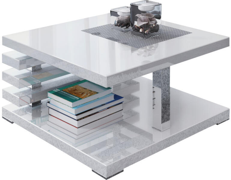 Kyoto dohányzóasztal magasfényű fehér A Kyoto dohányzóasztal modern designja és elegáns megjelenése tökéletes választás bármely nappalihoz. Kiváló minőségű, 32 mm-es laminált táblából és ABS furnérból készült, krómozott elemekkel kiegészítve, amelyek biztosítják a tartósságot és a stabilitást. Szélessége 60 cm, mélysége 60 cm, magassága 32 cm, magasfény