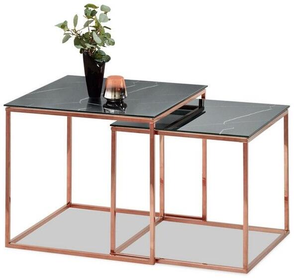 További méretek: Dohányzóasztal PARANA a nagyobb: szélesség - 45 cm mélység - 45 cm magasság - 41 cm Dohányzóasztal PARANA a kisebb: szélesség - 40 cm mélység - 40 cm magasság - 38 cm Felhasznált anyagok: asztallap - laminált üveg lábazat - fém
