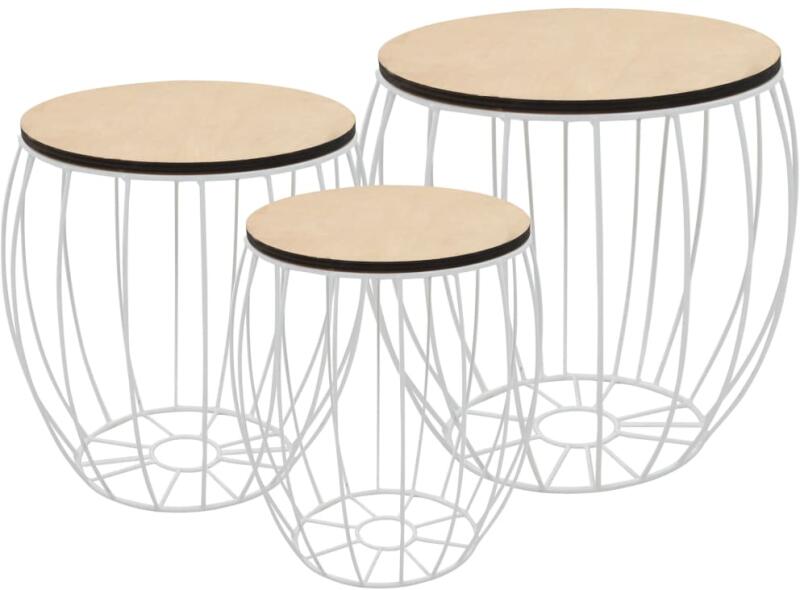 Keret színe: fehér Anyaga: nyárfa furnér + porszórt bevonatú vas Kicsi asztal mérete: 26 x 30 cm (Átmérő x Ma) Közepes asztal mérete: 30 x 35 cm (Átmérő x Ma) Nagy asztal mérete: 36 x 40 cm (Átmérő x Ma) Levehető tetővel Rakásolható A szállítmány 3 db dohányzóasztalt tartalmaz. Ez a három dohányzóasztalból álló garnitúra vintage bájt sugároz, és karakteres ele