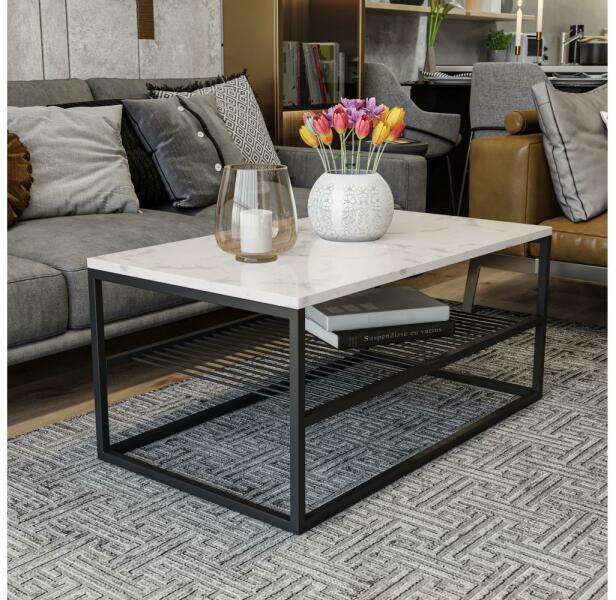 ASUDE dohányzóasztal. Egyszerű, modern stílusának köszönhetően bármilyen otthonba illik. Elegáns megjelenés a márvány dekornak köszönhetően. A fa és a fém kombinációja. Az asztallap laminált forgácslapból, a lábak pedig fémből készültek. A lap vastagsága: 1,8 cm. A lábak vastagsága: 1,5 x 1,5 cm. Az asztal egy rácsos polcot tartalmaz.