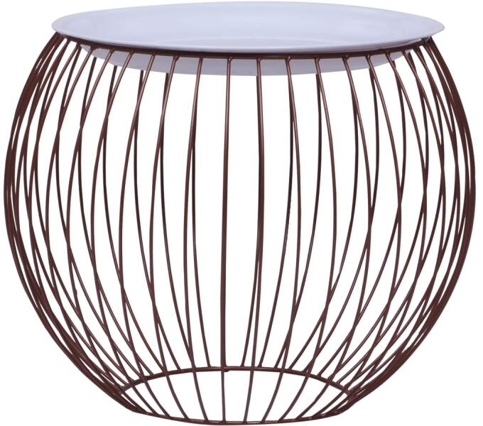 Váz színe: arany Asztallap színe: fehér Anyaga: fém, MDF Asztal mérete: 51 x 41 cm (Átmérő x Ma) Ez az egyedi, kosaras kialakítású dohányzóasztal különleges kiegészítője lesz otthonának. Tárolókosárként, kisasztalként, tálalóasztalként stb. is használható. Az MDF asztallap stabil és sima felülete biztonságos helyet kínál italai, gyümölcskosarai, újságai, táv