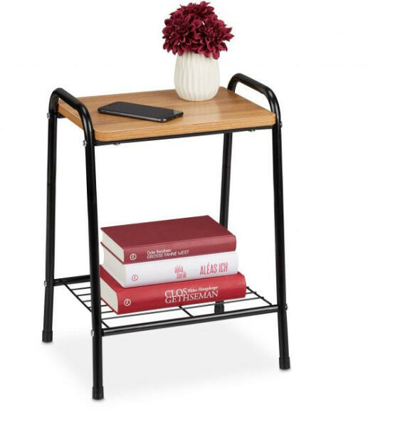 Retro design oldalasztal fekete-natúr 48x35x29,5 cm Két polcos retro stílusú oldalasztal. A fa megjelenés és a fekete fém dekoratív keveréke. Használja éjjeliszekrényként a hálószobában vagy, polcként a kanapé mellett a nappaliban. Méretek: 48 x 35 x 29,5 cm Felső polc mérete: 31,5 x 25 cm A rácsos polc mérete: 29,5 x 27 cm Max. 20 kg-ig terhelhető Anyag: fémb és MDF Szí