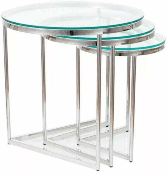 Elegáns és sokoldalú dohányzóasztal szett modern otthonokba A Trinity dohányzóasztal szett három különböző méretű, egymásba tolható asztalból áll. Mindegyik asztal edzett üveg lappal és krómozott acél vázzal rendelkezik. A legnagyobb asztal 55 cm átmérőjű és 56 cm magas, míg a kisebbek 45 cm és 35 cm átmérőjűek, 51 cm és 46 cm magasak. Az átlátszó üveglapok