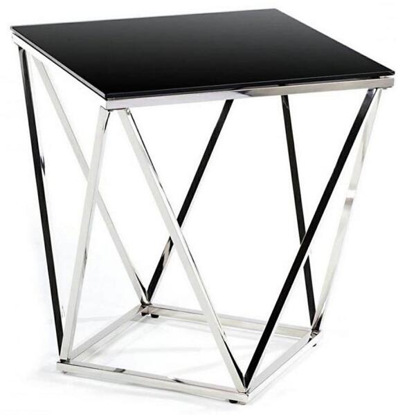 Kávésasztal. Egyszerű, modern stílusával bármilyen otthonba illik. A fém és az üveg kombinációja elegáns megjelenést kölcsönöz neki. Az asztallap edzett üvegből, a lábak fémből készültek. Az üveg vastagsága: 8 mm. Az asztal magassága: 55,5 cm. Szín: fekete, fényes króm.
