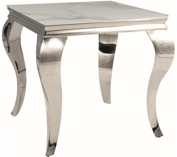 Prince II dohányzóasztal A Prince II asztalok érdekes választást jelentenek nappalijába, irodájába vagy előcsarnokába. Lábaik hullámos formával büszkélkedhetnek, amely garantáltan felkelti a figyelmet. Az asztallap kerámiából fehér márvány textúrájú. Tökéletesen kiegészíti az ezüst fém alapot. Az így létrejött kombináció olyan bútorokat idéz, mintha nemesi lak