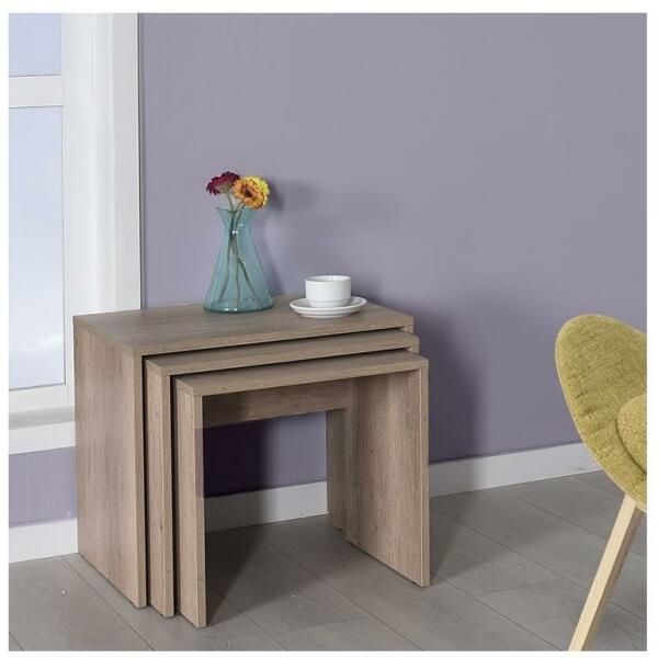 Egy dohányzóasztal, amelyen tárolhatja azokat a dolgokat, amelyeket kéznél szeretne tartani. Egyszerű, modern stílusának köszönhetően bármilyen otthonba illik. forgácslapból készült. Anyagvastagság: 16 mm. A kisasztal méretei: 42 x 45 x 36 cm. A középső asztal méretei: 45 x 50 x 38 cm. A nagy asztal méretei: 47 x 55 x 40 cm. Faanyagminta: diófa.