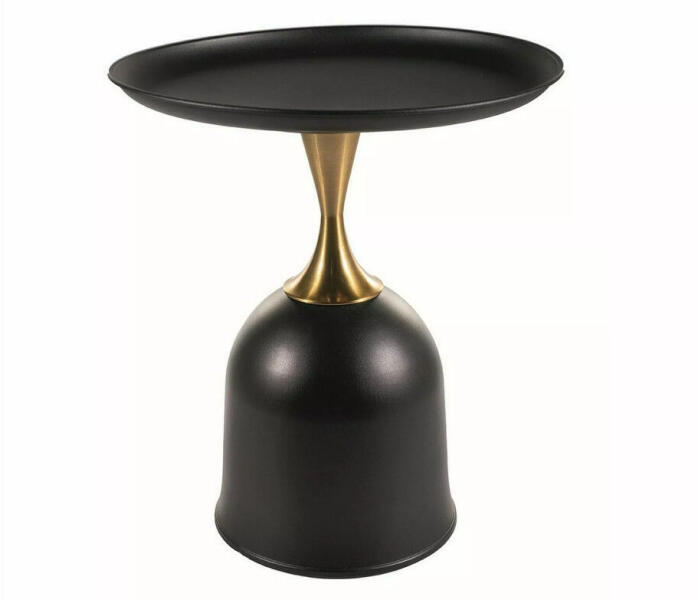 Elegáns és modern dizájn a nappali középpontjában A Libra dohányzóasztal egy különleges, kehely formájú alkotás, amely ötvözi a modern és klasszikus stílusjegyeket. A 51 cm átmérőjű kerek asztallap és a 61 cm magas állvány matt fekete fém kivitelben készült, amelyet elegánsan kiegészít az arany színű, szálcsiszolt középső elem. Az asztal stabil szerkezetének k