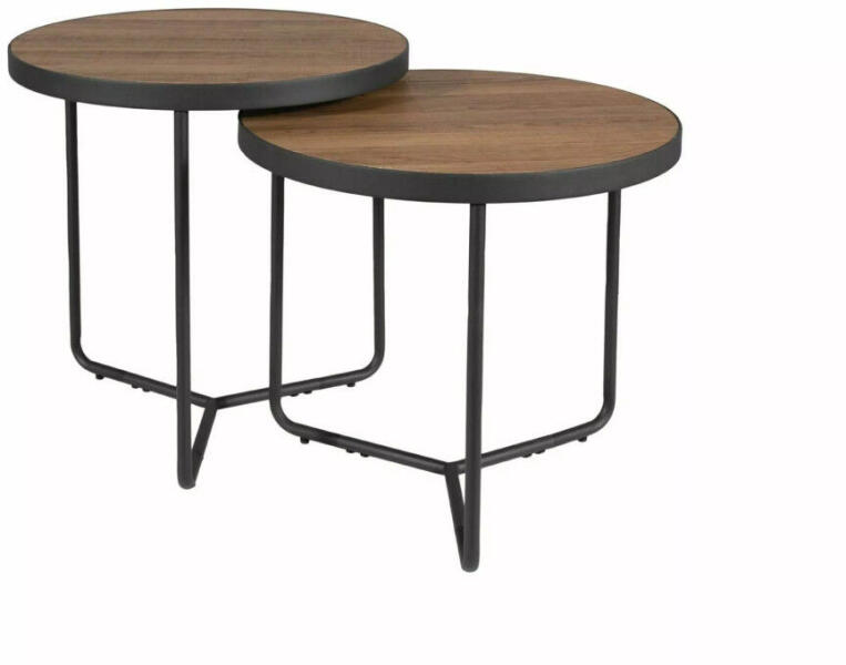 Modern és sokoldalú dohányzóasztal szett a stílusos otthonokhoz A Penelope dohányzóasztal szett két különböző méretű, kör alakú asztalkából áll. A dió színű MDF asztallapok és a fekete fém vázszerkezet tökéletes összhangot alkotnak. A nagyobb asztalka 50 cm átmérőjű és 50 cm magas, míg a kisebb asztalka 50 cm átmérőjű és 45 cm magas. A modern dizájn és az i