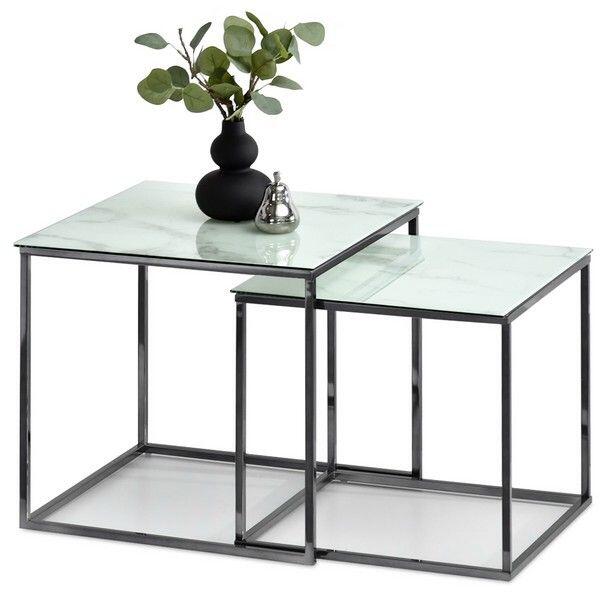 További méretek: Dohányzóasztal PARANA a nagyobb: szélesség - 45 cm mélység - 45 cm magasság - 41 cm Dohányzóasztal PARANA a kisebb: szélesség - 40 cm mélység - 40 cm magasság - 38 cm Felhasznált anyagok: asztallap - laminált üveg lábazat - fém
