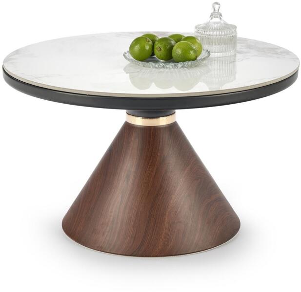 Collins dohányzóasztal A Collins asztal több színt is ötvöző, reprezentatív megjelenésével fogja megnyerni Önt. Ízléses kiegészítője lesz irodájának, előcsarnokának vagy modern nappalijának. A 70 cm átmérőjű kör alakú tányér kerámiából készült, és a textúra díszíti: világos márvány. Ellentéte a fekete fémmel, amely az arany gyűrűre szűkül a láb legke