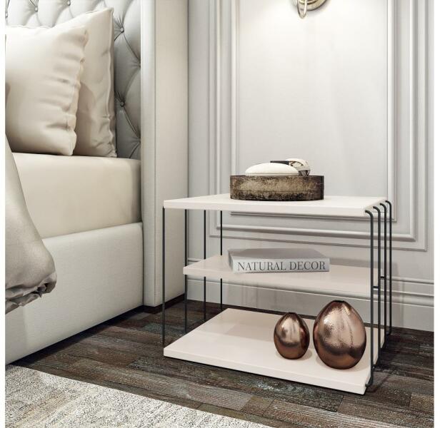 Fehér színű kisasztal. Olyan dolgok tárolására szolgál, amelyeket kéznél akar tartani. Egyszerű, modern stílusának köszönhetően szinte bármilyen nappaliba vagy hálószobába illik. Laminált forgácslapból és fémből készült. Anyagvastagság: 1,8 cm. Az asztal két polcot tartalmaz. A polcok magassága: 14 cm. A középső polc szélessége: 20 cm.