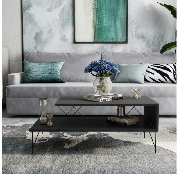 Gyártó: Kalune Design Modell: 854KLN2825 Leírás: Kávésasztal a kéznél lévő dolgok tárolására. Egyszerű, modern stílusának köszönhetően bármilyen otthonba illik. Fekete színben. Laminált forgácslapból készült, lábai fémből. Az anyagvastagság: 1,8 cm. A polc magassága: 23 cm. A lábak magassága: 15 cm. Tulajdonságok: 100% melamin bevonatú forgácslap Vastagság: 18