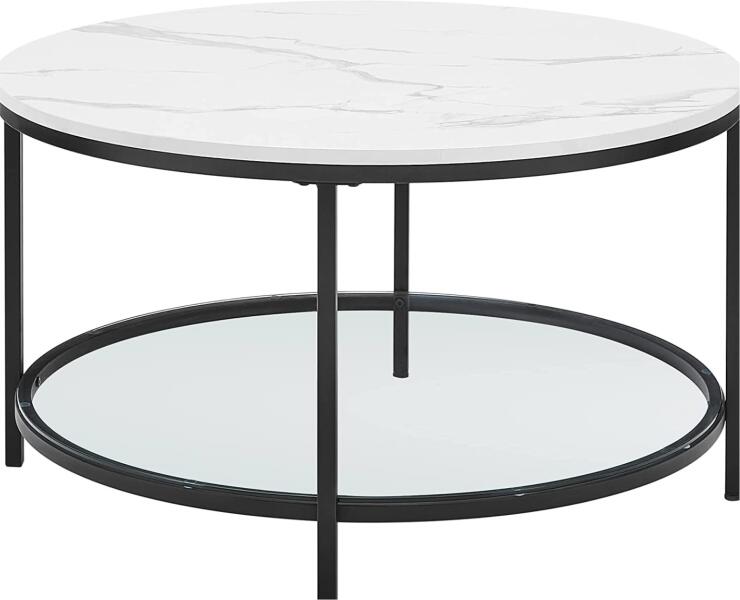 dohányzóasztal, nappali asztal, kanapé asztal, üveglappal, nagy tárolóhely, könnyen összeszerelhető, modern stílus, fehér márvány hatás, fekete keret Modern stílus: fehér márvány hatású asztallap, fényes edzett üvegpolc alatta és időtlen fekete acél lábak – ez a tökéletes kombináció az igényes élethez Megbízható segítő a mindennapokban: ki szereti a billegő b