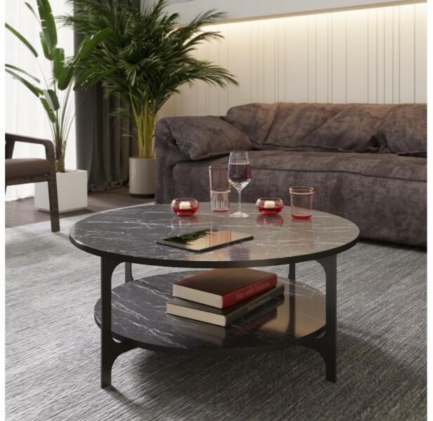 Gyártó: Hadley Modell: 541HDL1212 Leírás: Kávésasztal polccal. Egyszerű, modern stílusával bármilyen otthonba illik. Elegáns megjelenés a márvány dekornak köszönhetően. Az asztallap laminált forgácslapból, a lábak fémből készültek. A lap vastagsága: 1,8 cm. A polcok magassága és átmérője: 20 x 82,6 cm. Tulajdonságok: 100% melamin bevonatú forgácslap Vastagság: 18