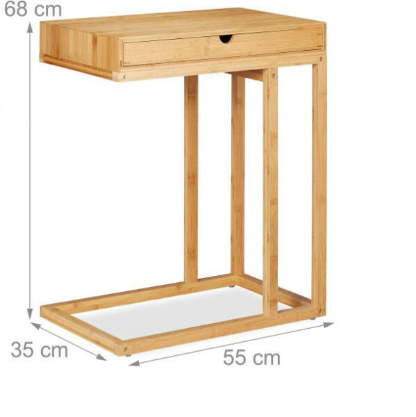 Bambusz oldalasztal fiókkal Tágas fiókkal rendelkezik Erős bambuszból készült Gyors, egyszerű szerelés Egyszerűen csúsztassa a kanapé alá Oldalasztal mérete és anyaga Méret: H x Sz x M:. 68 x 55 x 35 cm Asztallábak hossza: 61 cm Állvány magassága: 3,5 cm Maximális terhelés: 5 kg Súly: 5,4 kg Anyag: Bambusz