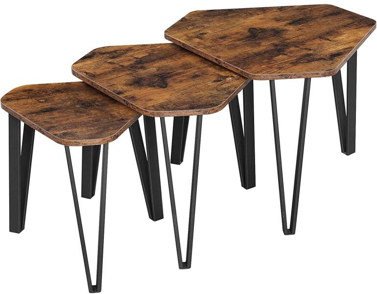 egymásba ágyazott dohányzóasztal, 3 záróasztal készlet nappaliba, egymásra rakott oldalsó asztalok, erős és könnyen összeszerelhető, acélváz, ipari stílusú, rusztikus barna és fekete: Rusztikus báj: A rusztikus, barna fa felsők a régi idők klasszikus stílusát árasztják, a merev acélkeretek pedig ipari hangulatot kölcsönöznek. Most összeállnak ezen az asztalkészlet