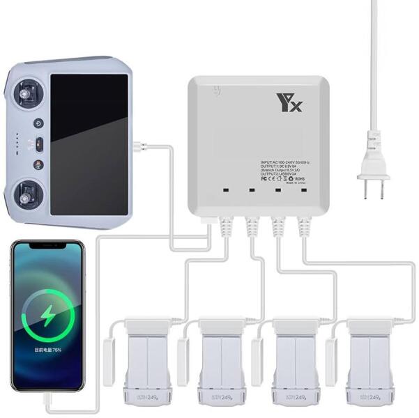 Hálózati párhuzamos gyorstöltő DJI Mini 3, Mini 3 Pro, Mini 4 Pro sorozatú drón akkumulátorához, mely képes egyszerre feltölteni 4 db akkumulátort, 1 telefont és a távirányítót mindössze 70 perc alatt. Bemenet: AC 100-240V 50/60Hz Kimenet: DC 8,5V 4x2 A USB kimenet: DC 5V 2x3 A Ház: műanyag Méret: 115 x 115 x 28 mm Tömeg: 540 gramm Töltési idő: ~70 perc