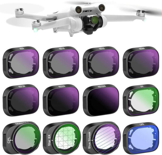 NEEWER DJI Mini DJI Mini 3/Mini 3 Pro 12in1 ND Szűrő Kit - ND8/ 16/ 32/ 64/ 128/ 256/ ND1000/ UV/ CPL/ Anamorfikus/ Fényszennyezéscsökkentő/ Csillagszűrők Filter Set A Neewer CM24 egy teljes drón objektívszűrő készlet, amelyet kifejezetten a DJI Mini 3 és Mini 3 Pro drónokhoz terveztek. Ez a készlet ideális választás a drónos videózás és fényképezés szerelmeseinek, akik f