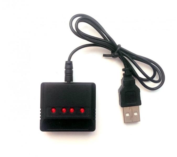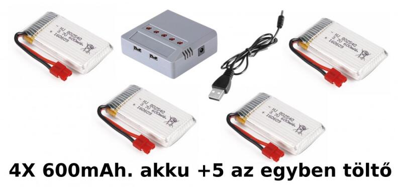 4 kimenetes töltő hubEzzel a töltővel egyszerre tölthetsz 4 db akkumulátort. Walkera csatlakozós akksikat lehet tölteni vele (vagy átalakító kábellel más típusokat is). A következő drónok akkumulátorai rendelkeznek ilyen csatlakozóval, tehát ezekkel átalakító nélkül is kompatibilis: Syma X5, X5C, X5SC és X5SWA csomag nem tartalmaz akkumulátorokat. Tulajdonságok:Csatlako