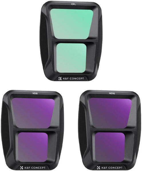 K&F Concept CPL+ND8+ND16 szűrő készlet DJI Air 3 drónhoz. Több lehetőséget biztosít lenyűgöző légifelvételek készítéséhez. A K&F Concept készlet 3 szűrőt tartalmaz a DJI Air 3 drónhoz, amelyek kiváló minőségű AGC optikai üvegből készültek – CPL szűrő, ND8 szűrő és ND16 szűrő. Segítségükkel könnyedén készíthet látványos videókat és fotókat!