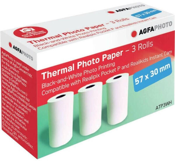 Pocket Printer és Realikids Instant Nyomtató Papír 3x tekercsben Főbb jellemzők: Fekete-fehér fotónyomtatáshoz Alkalmas az AgfaPhoto Realipix Pocket P és a Realikids Instant Cam készülékekhez