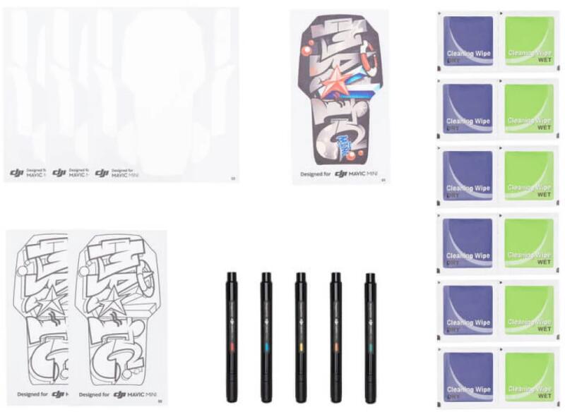 Üres géptetőre ragasztható matricákat és színes tollakat tartalmazó készlet, amivel egyedivé varázsolható a Mavic Mini