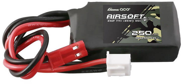 Gens ace 250mAh 7.4V 35C 2S1P Airsoft Gun Lipo akkumulátor JST-SYP Plug csatlakozóval. A Gens ace 250mAh 7.4V 35C 2S1P Airsoft Gun Lipo akkumulátor kifejezetten az Airsoft rajongók számára készült, megbízható energiát biztosít az ASG replika számára. Maximum 35C folyamatos kisütést kínál, elegendő energiát biztosítva a modell zökkenőmentes és megbízható működéséhez. G
