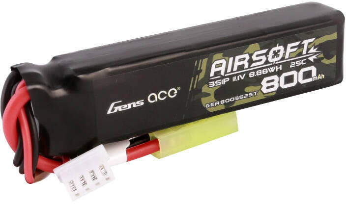 Gens Ace Lipo 800MAH 11.1V 25C 3S1P Airsoft Gun Lipo akkumulátor Mini Tamiya Plug csatlakozóval A Gens Ace Lipo akkumulátor Mini Tamiya csatlakozóval egy speciális áramforrás, amelyet az olyan airsoft fegyverutánzatokhoz terveztek, mint az M4 Shorty. A lítium-polimer cellákkal felszerelt akkumulátor 11,1 V feszültséget és 800 mAh kapacitást kínál, ami hatékony és tartós játék