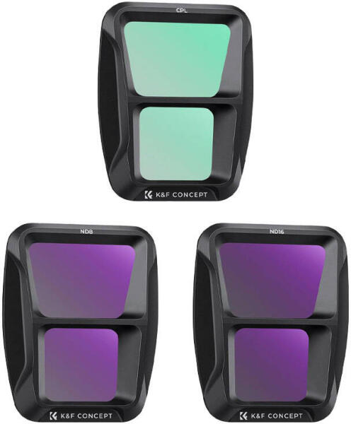 Filters K&F Concept CPL+ND8+ND16 Kit for DJI Air 3 K&F Concept CPL+ND8+ND16 filter set for DJI Air 3 Provide more opportunities to record exceptional aerial shots. The set by K&F Concept includes 3 filters for the DJI Air 3 drone made of high-end AGC optical glass - CPL filter, ND8 filter and ND16 filter. With their help you will easily create a lot of spectacular videos and photos! Th