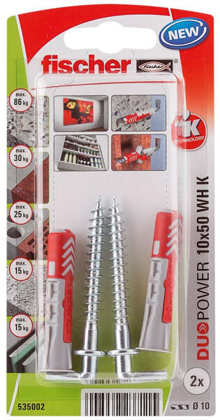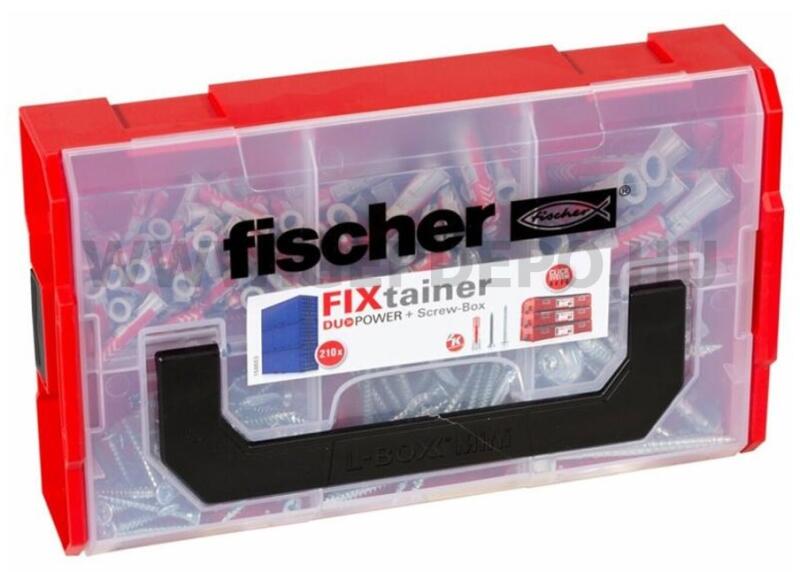 Fischer FIXtainer duopower+csavar A tipli mind normál, mind átmenő rögzítésre alkalmas. Alkalmas fához, forgácslaphoz és akasztócsavarokhoz Tartalma: Tiplik: 60x 6x30 mm 30x 8x40 mm 15x 10x50 mm Csavarok: 60x 4,5x40 mm 50x 50x 8 mm