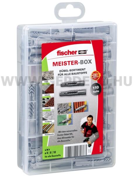 Praktikus mester-box UX 6, UX 8, UX 10, UX 6 R és UX 8 R dübelekkelA fischer UX/UX R MESTER-BOX tartalma: 25 db UX 6 x 35, 25 db UX 6 x 35 R, 25 db UX 8 x 50, 25 db UX 8 x 50 R, valamint 10 db UX 10 x 60 univerzális dübelA MESTER-BOX kiváló minőségű, ütésálló műanyagból készül, és ideális műhelyekben és építkezésekenAz átlátszó fedél könnyű áttekinthetőséget biztos