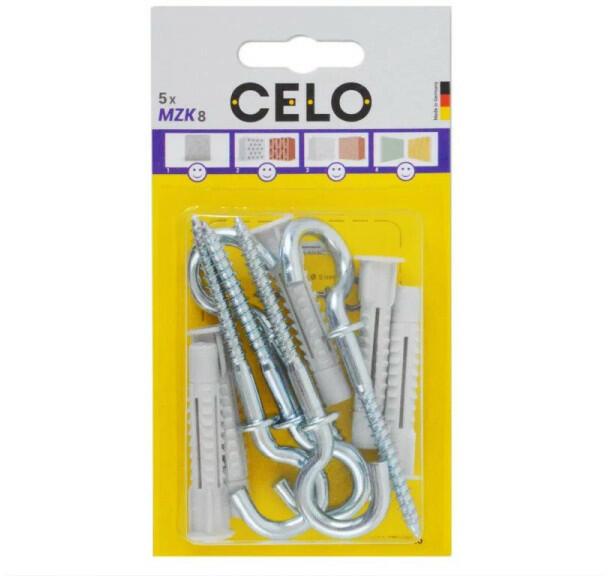 CELO MZK univerzális galléros műanyag dübel 8 x 49 + 5,8 x 97 körkampós csavar -5 db A készlet tartalma: 1 x Szemescsavar 5,0x86 galv. peremes, bliszteres kiszerelésben1 x MZK 8 univerzális műanyag dübel gallérralA CELO MZK univerzális galléros dübel milliószor bizonyította kiválóságát és szinte az összes építőanyagban használható. A dübel 4 irányú tágulása a töm