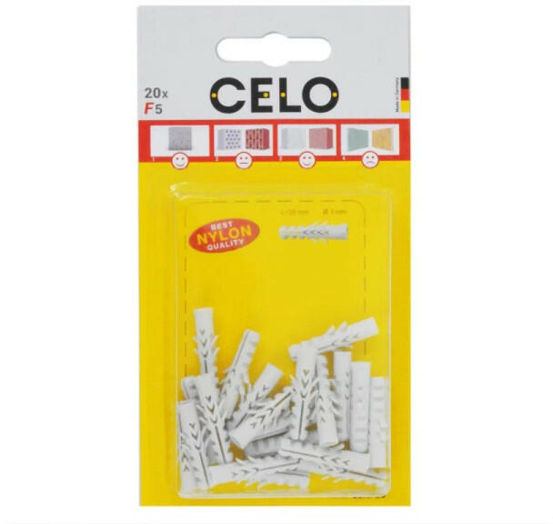 CELO NF 5 szárnyas dübel - 20 db A CELO F általános dübel nagy tágulási képességének köszönhetően magas kihúzási értékekkel rendelkezik. Széles méret választékban kapható 4-20 mm átmérőig. Az F általános dübel ideális választás tömör építőanyagokhoz, de üreges tégla és pórusbeton szerkezetekben is jó terhelhetőségi értékekkel bír. Jó csavarvezetése m