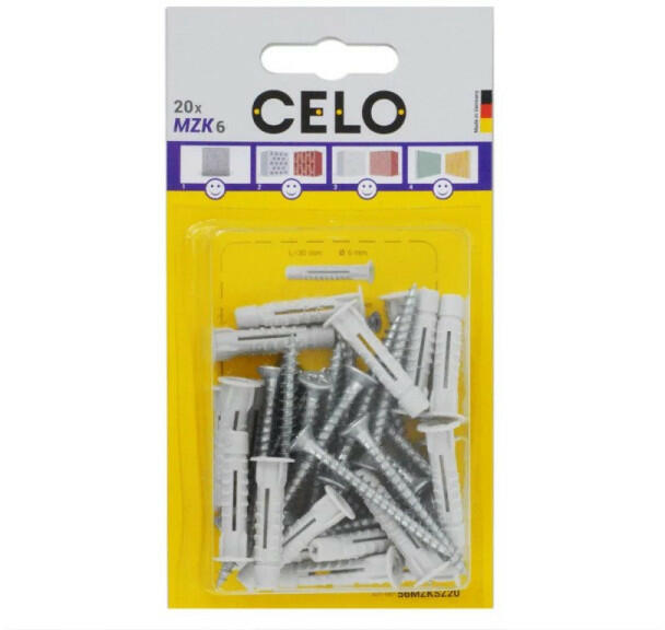 CELO MZK univerzális galléros műanyag dübel 6 x 30 + 4,5 x 40 facsavar - 20 db A készlet tartalma: 1 x 4,5 x 40 facsavar - 20 db1 x MZK 6 univerzális műanyag dübel gallérralA CELO MZK univerzális galléros dübel milliószor bizonyította kiválóságát és szinte az összes építőanyagban használható. A dübel 4 irányú tágulása a tömör anyagokban és csomózó effektusa üreg