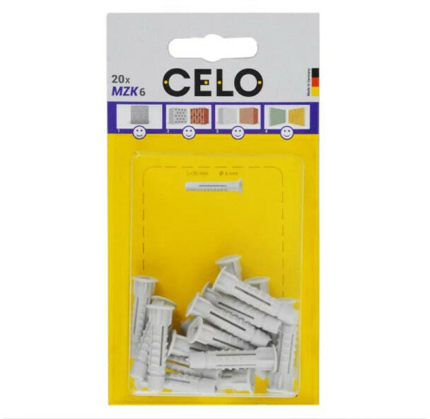 CELO MZK univerzális galléros műanyag dübel 6 x 30 - 20 db A CELO MZK univerzális galléros dübel milliószor bizonyította kiválóságát és szinte az összes építőanyagban használható. A dübel 4 irányú tágulása a tömör anyagokban és csomózó effektusa üreges építőanyagokban és gipszkartonban, mindig megfelelő rögzítést biztosít magas terhelhetőséggel. A gallér