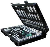 94 részes króm-vanádium dugókulcs és szerszám készlet. Gyorskioldóval az alkalmazott szerszámok, eszközök cseréjéhez. Dugókulcsok (1/4" 4-14mm, 1/2" 10-32mm) speciális profillal, ami védi az anyákat, és megkönnyíti a kopott anyák és csavarok nyitását. Súly: 6,5kg.
