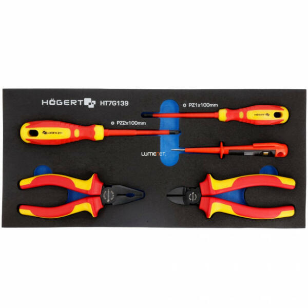 HT1P909 és HT1P903 1000 V szigetelt fogó, HT1S968 és HT1S969 csavarhúzó, HT1S981 feszültségvizsgáló; csavarhúzók kiváló minőségű CrMo ötvözött acélból; technikai hab.