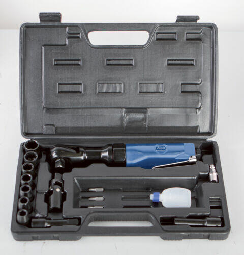 Pneumatikus racsnis kulcs_x000D__x000D_Racsnis kulcs készlet praktikus kofferban_x000D__x000D_Kompakt, könnyű, kétoldalú forgásirány_x000D__x000D__x000D__x000D _Ideális menetes csavarok ki és becsavarásához a nehezebben hozzáférhető helyeken, ahol lehetetlen mozgatni a klasszikus racsnis kulcsot. _x000D__x000D_Üzemi nyomás: 6,3 bar_x000D__x000D_Levegőigény: 77 l/perc_x000D__x000D