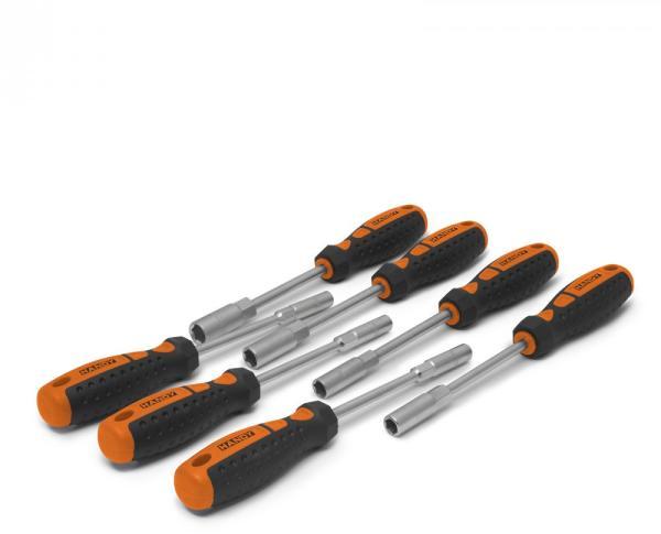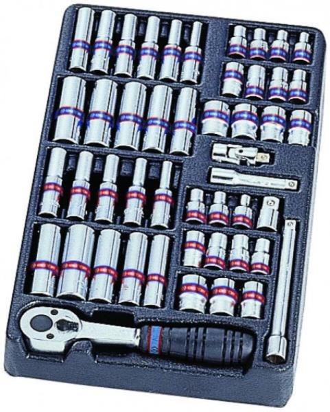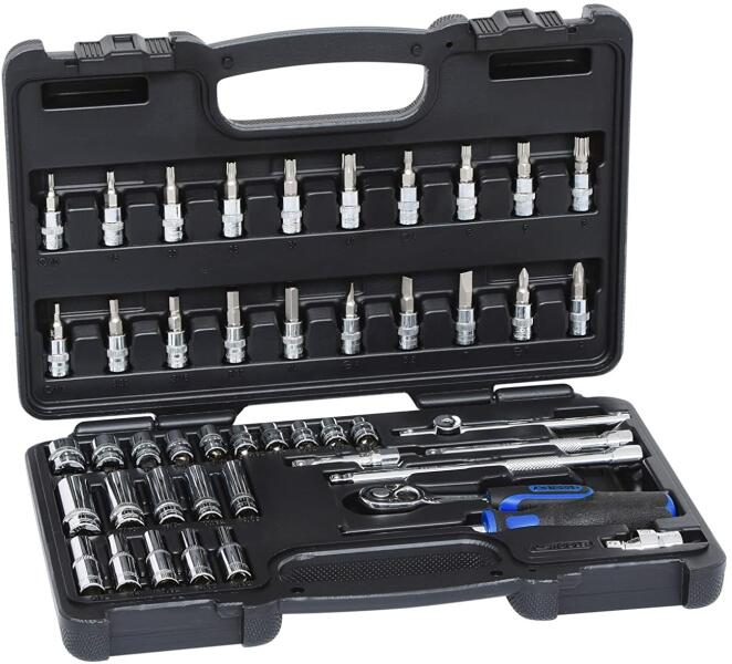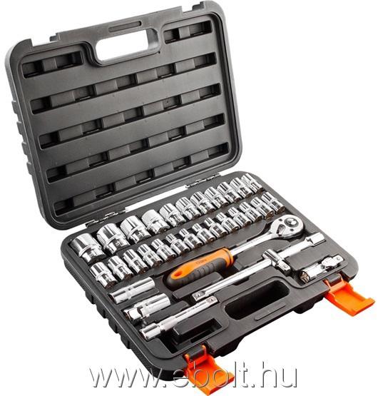 Dugókulcs készlet 1/4" colos ( műanyag koffer ), AF5/32"-1/2", 47 részes, 6 szög. Suprelock belső profillal a tökételes nyomatékátvitel érdekében a csavarfejek lapjára feszül. Gyártói katalógus szám: 911.0847. 72 fogú 5°-os racsni irányváltós golyós rögzítés gyorskioldós műanyag dobozban Anyag króm-vanádium acél olajedzett Szállítás terjedelme 918.1402 Toldószá