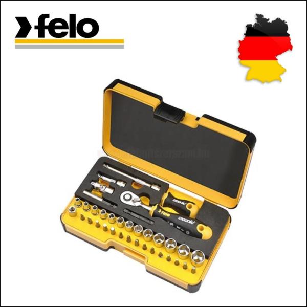 FELO Dugókulcs és bithegy készlet 1/4" 36 részes R-Go - FELO (05783616) Ipari felhasználásra alkalmas, csúcsminőségű precíziós dugókulcs és bit készlet Németországból. R-Go XL készlet műanyag dobozban mindegyik szerszámnak saját rögzített helye van. Tartalma: Ergonic racsnis kulcs, Ergonic marokcsavarhúzó, hosszabító 1"x50, 1"x100, adapter: C6,3-1/4" E6,3-1/4"x50, Dugó