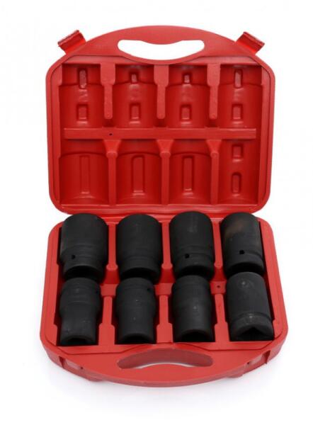 Ütvecsavarozó dugókulcs készlet 1" 8db A készlet 8 db gépi dugókulcsot tartalmaz, amelyeket pneumatikus ütvecsavarozókhoz használat. Használható négyszögű 1"-es racsnihoz is. A dugókulcsok erős és ellenálló króm-vanádium acélból készültek. A dobozban 22-től 41 mm méretig találhatóak kulcsok. A kulcsok egy praktikus dobozban vannak. INFORMÁCIÓK Négyszögű rancsi: 1